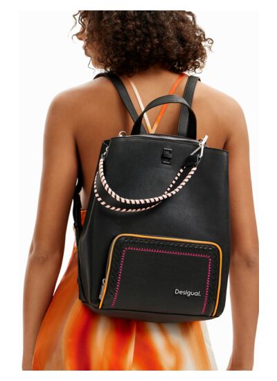 Fabriqué par Desigual, ce sac à dos est en tissu effet cuir avec des détails contrastants. Il dispose de plusieurs poignées pour un port multi-positions, ainsi que de compartiments et poches variés pour une organisation optimale. Attention, ne pas laver.