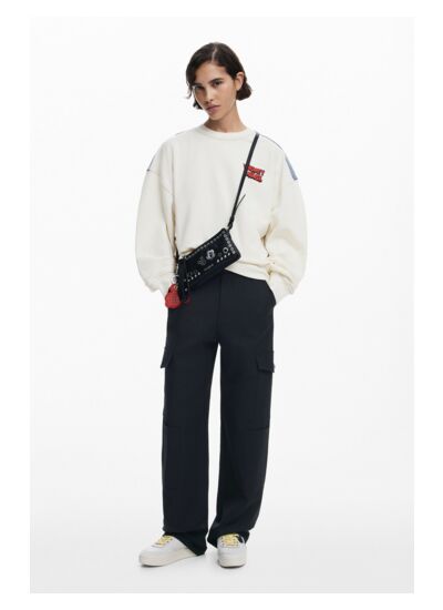 Réponse. Il est orné de clous métalliques et d’une broderie représentant Mickey Mouse™, emblème Disney™.