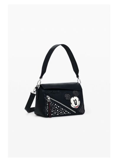 Dimensions moyennes, tissu effet cuir, clous métallisés, broderies, patch Mickey Mouse. Poches intérieures et extérieures. Poignée et bandoulière amovible. Ne pas laver.