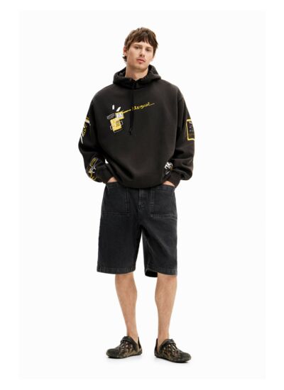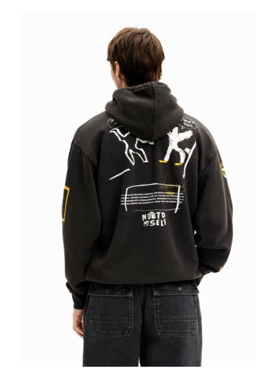Lavage en machine à froid à l’envers, cycle délicat. Sweat à capuche avec fermeture élastique. Motifs urbains imprimés. Manches longues. Marque Desigual.