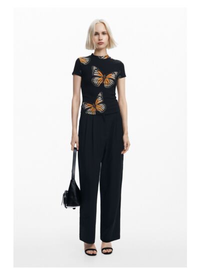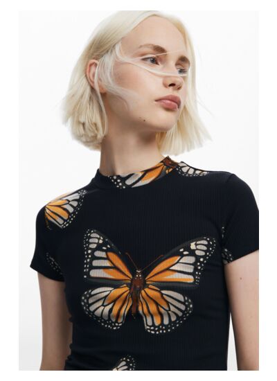 Lavage en machine à froid à l’envers, cycle délicat, pour préserver la qualité du tissu et la vivacité des couleurs. Composition maille fine, manches courtes, col rond classique, imprimé papillons.