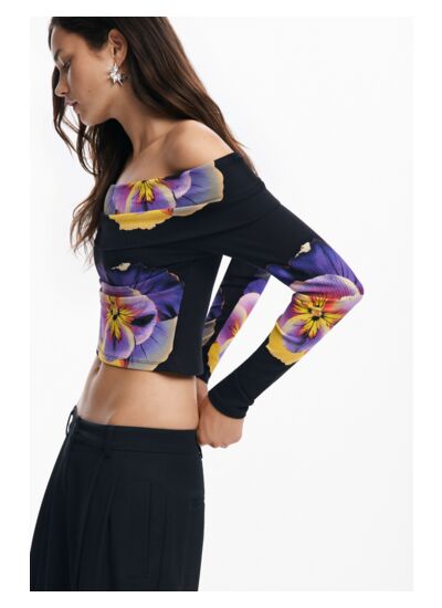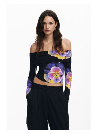 Sublimez votre allure avec ce T-shirt à encolure bardot et manches longues, signé M. Christian Lacroix pour Desigual. Un imprimé floral audacieux qui transforme un basique en pièce d’exception.