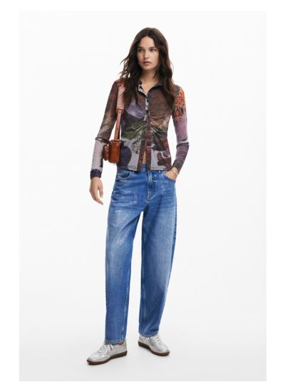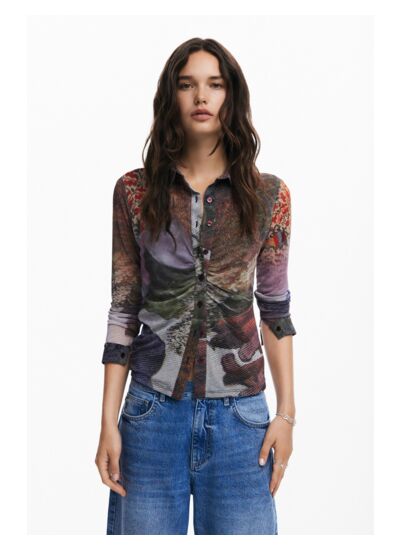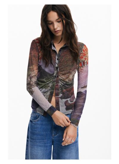 Lavage en machine à froid à l’envers, cycle très délicat. Matière maille légère, fermeture à bouton, col de chemise, manches longues. Imprimé Arty inspiré des sols de forêt automnale. Marque : Desigual.