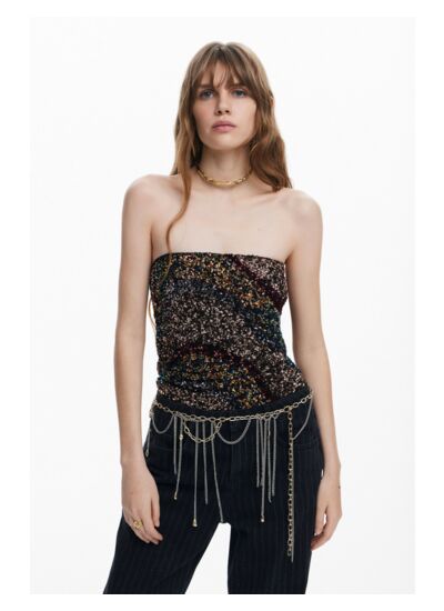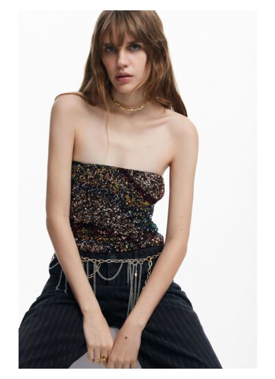 Ce top strapless signé Desigual allie audace et sophistication. Sa coupe épurée met en valeur vos épaules tout en offrant un confort optimal. Les sequins argentés captent la lumière à chaque mouvement, créant un effet glamour et dynamique. Idéal pour composer une tenue chic, il se marie parfaitement avec un pantalon noir ou une jupe taille haute.