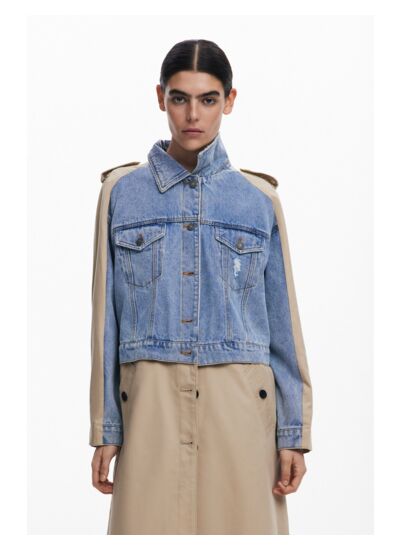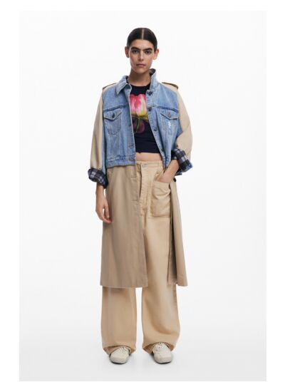 Alliez audace et élégance avec ce trench-coat unique signé Desigual, où le classique rencontre l’esprit denim. Une pièce qui redéfinit le layering avec sa veste en jean trucker intégrée sur le haut et les manches.