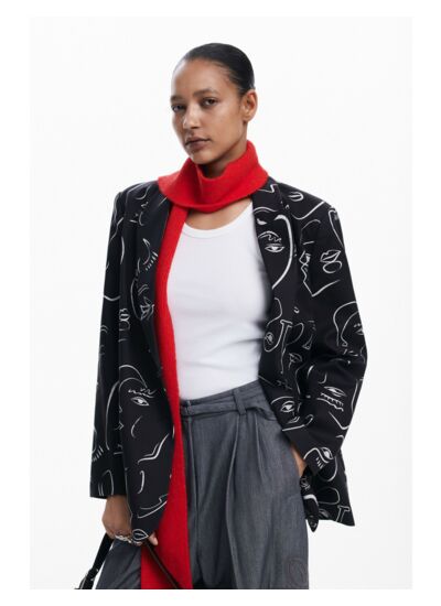 Affirmez votre style avec cette veste à coupe droite qui allie modernité et audace. Son col en V et son imprimé de silhouettes de visages en contraste captivent le regard et insufflent une énergie artistique à votre tenue.