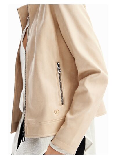 Réponse : La veste est fabriquée en PU avec des manches en maille côtelée.