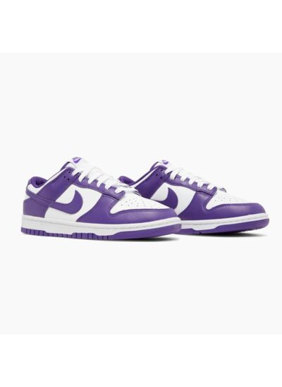 Quelles sont les caractéristiques principales des Nike Dunk Low Championship Court Purple ? Ces sneakers se distinguent par leur design iconique mêlant cuir premium et suède, offrant à la fois durabilité et style. La teinte Court Purple apporte une touche unique et tendance, tandis que la semelle en caoutchouc garantit une excellente adhérence et confort tout au long de la journée.