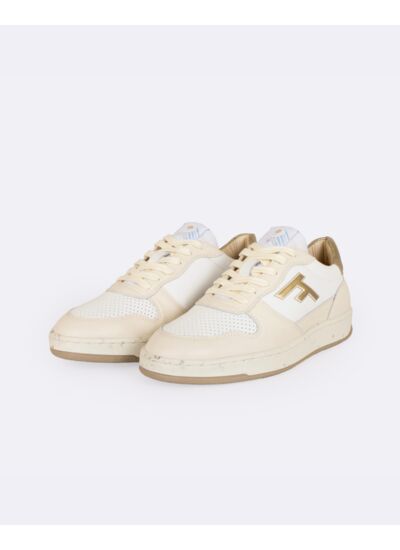 Semelle extérieure : Autres matériaux (caoutchouc synthétique recyclé à 10% / 10% de balles de tennis recyclées),Découvre la basket ALDER blanche et or, une basket citadine et innovante en cuir, fabriquée au Portugal.