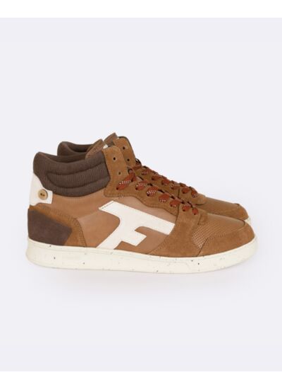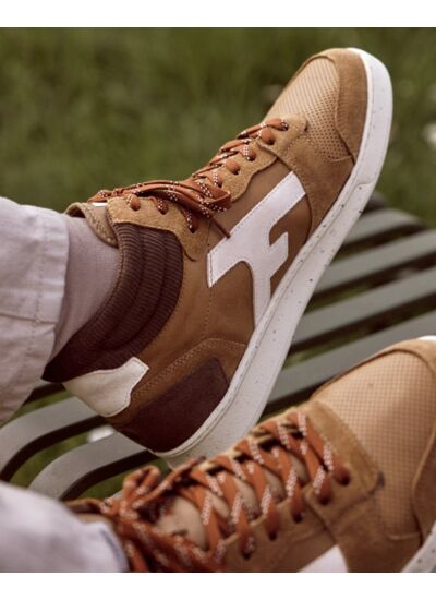La basket HAZEL MID camel se distingue par sa tige en cuir nubuck et suède de haute qualité, associée à des empiècements en suède pour un look tendance et élégant. Son col en polyester recyclé offre un confort optimal et une meilleure tenue du pied, tandis que sa doublure en mesh recyclé assure une respirabilité accrue. Ses lacets en coton tricolore viennent parfaire le look de cette paire de baskets, tout en offrant une tenue optimale.