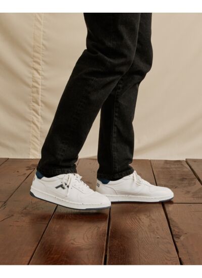 Cette basket homme citadine et innovante est fabriquée au Portugal, à partir de matériaux durables et recyclés. Elle dispose d'une semelle en caoutchouc synthétique recyclé contenant des balles de tennis recyclées, récoltées dans des clubs de tennis près de Porto.