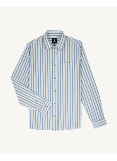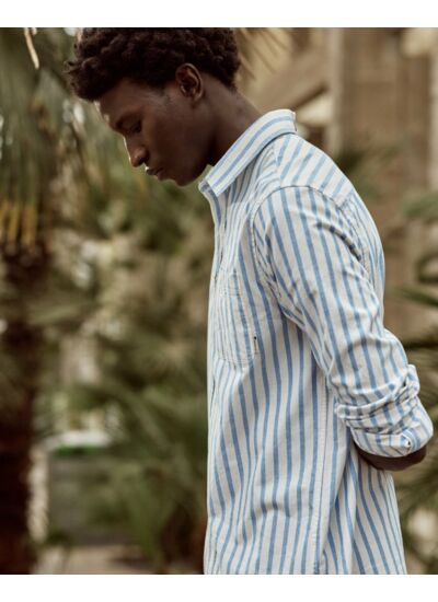 Confectionnée en toile de coton à l’aspect légèrement brut, cette chemise homme respire l’été avec ses rayures verticales bicolores. Sa poche poitrine discrète et son étiquette tissée FAGUO ajoutent une touche subtile de caractère à cette coupe droite classique.