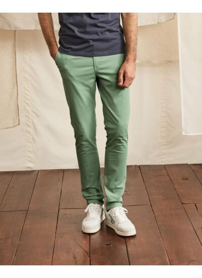 75% coton organique, 23% coton recycle, 2% elasthanne,Le chino BRIX vert clair de chez FAGUO est un pantalon emblématique du vestiaire masculin. Sa coupe slim (ajustée) a été élaborée pour flatter chacune des morphologies, offrant ainsi un équilibre parfait entre élégance et confort. Conçu pour s'adapter à tous les environnements, ce chino vert en sergé, agrémenté d'une touche d'élasthanne, garantit une douceur exceptionnelle et une liberté de mouvement optimale. Chaque détail compte, du pantalon teint-en-pièce qui ajoute une texture unique aux boutons doubles à la ceinture qui apportent une note sophistiquée. Avec le logo arbre en feutre, ce chino vert incarne l'engagement durable de la marque FAGUO. Chaque achat du modèle de chino vert BRIX contribue à la plantation d'arbres, une action concrète pour préserver notre planète. Ce chino homme est parfait pour être porté afin de vivre pleinement entre ville et nature.,Points clés :Sergé de coton bio (75%) et coton recyclé (23%)Une touche d'élasthanne pour le confortPantalon teint-en-pièce plein de douceurDouble boutons à la ceintureLongueur entre-jambe 82 cm (taille 32)Ref : S21PA0101 GRE01