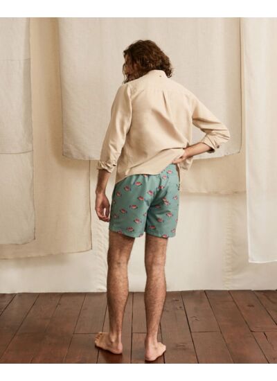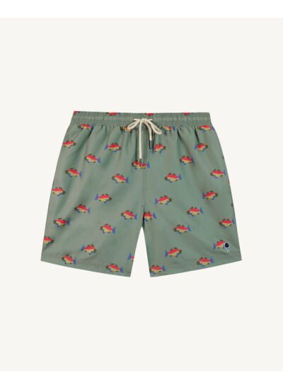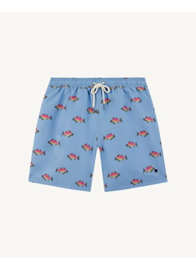 Son imprimé poisson, développé par le studio FAGUO, apporte une touche ludique et originale, en clin d’œil à la thématique de saison inspirée de la pêche. La ceinture élastiquée avec cordons de serrage assure un ajustement optimal, tandis que le slip intérieur intégré garantit un maintien confortable. La poche au dos fermée par un bouton offre une fonctionnalité pratique pour emporter l’essentiel.