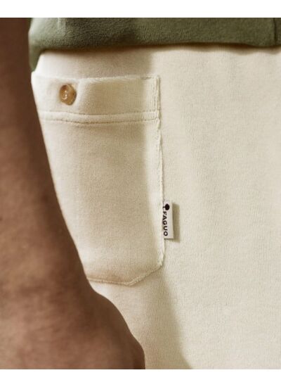 82% coton dont 41% recyclé, 18% polyester (100% recyclé),Le short en éponge écru CHOUSSY est l’allié parfait pour les journées estivales, pensé par FAGUO pour t’accompagner aussi bien en ville qu’après une baignade.