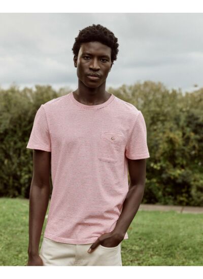 Imaginé par le studio FAGUO, ce modèle de t-shirt homme revisite le basique avec sa matière en jersey moucheté rayé qui lui apporte une texture subtile et raffinée. Avec son col rond et sa poche poitrine, il s’inscrit dans un style intemporel, parfait pour toutes les occasions.
