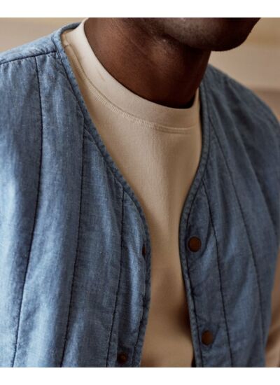 Réalisé en chambray matelassé vertical, il offre une texture élégante et structurée tout en restant légère, idéale pour jouer avec les superpositions.