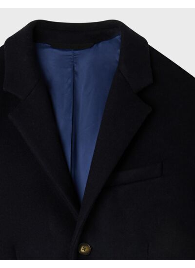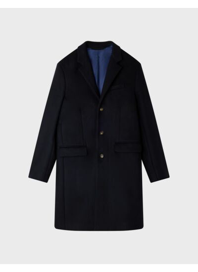 Le manteau Evan en drap de laine marine possède un col tailleur et un tombé droit pour une allure citadine et élégante.