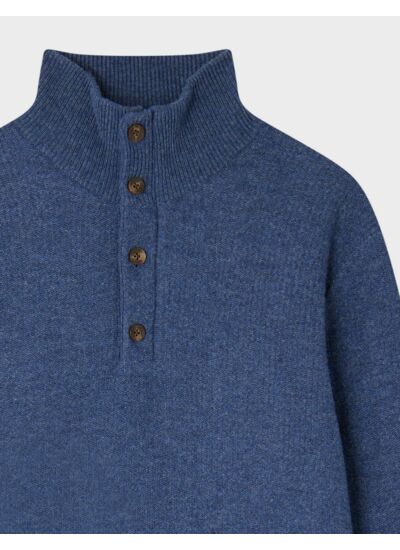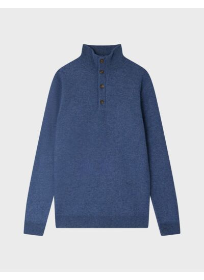 Le pull Chris en laine et cachemire bleu dispose d'un col camionneur boutonné. Très confortable et élégant, il peut se porter facilement sur un t-shirt ou une chemise.