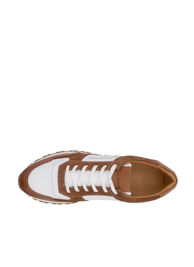 chaussure sneaker bas 6 œillets, cuir blanc avec des empiècements en daim marron.Appréciez le confort des sneaker