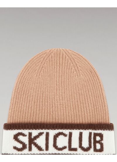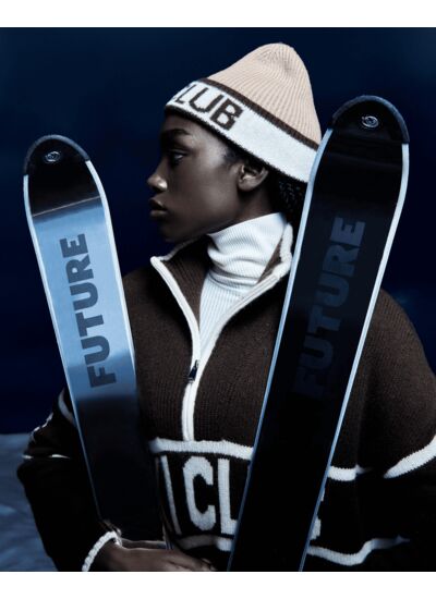 Jeux de contrastes et lignes futuristes pour ce bonnet côtelé et confectionné en cachemire 6 fils. Infiniment doux, il affiche des bandes contrastées et un message "Ski Club" au revers. Élevez votre allure vers des sommets et traversez la saison à la pointe du style !