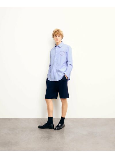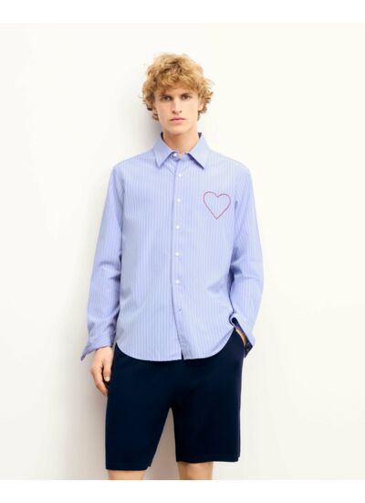 Cette chemise à rayures dévoile un cœur délicatement brodé et surpiqué sur la poitrine. Munie d'un col chemise et de manches longues, elle dévoile une fermeture et des poignets boutonnés pour une silhouette sophistiquée.