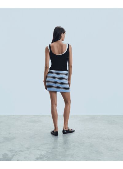 Un jeu de rayures contrastées s'invite sur cette jupe courte confectionnée en cachemire 2 fils. Telle une seconde peau, elle dévoile une coupe ajustée pour une silhouette élégante et structurée. Jouez le total look avec le top coordonné.