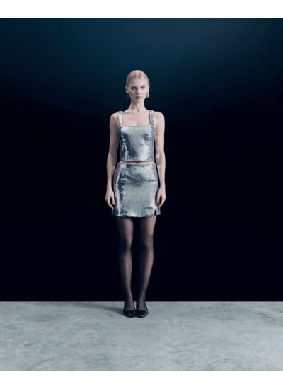 Brillez de mille feux avec cette jupe courte parée de paillettes argentés. Sa coupe structurée et son tombé impeccable en font une pièce maîtresse de votre vestiaire. À porter en total look avec le top assorti pour un effet irrésistible.