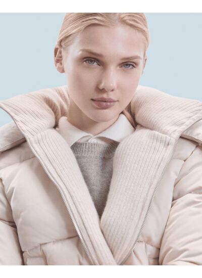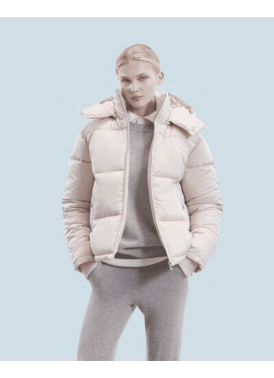 Enveloppez-vous de chaleur et de douceur avec cette doudoune matelassée et délicatement doublée de cachemire. Un col montant et une capuche à patte de boutonnage vous protègent du froid avec élégance. Sa coupe courte et ajustée, rehaussée de cordons de serrage et de deux poches, assure une allure impeccable en toutes circonstances.