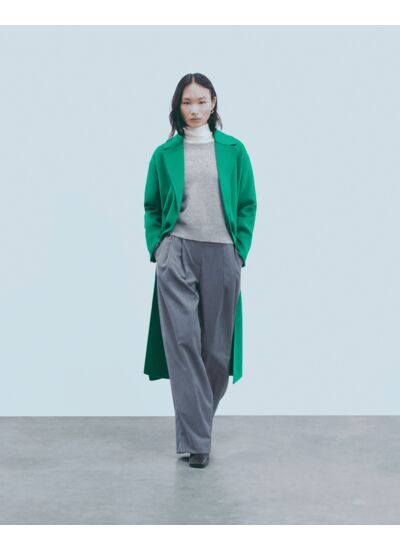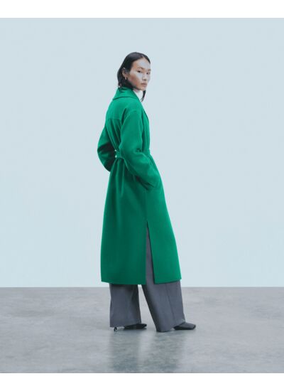 Ce manteau long, confectionné en laine certifiée RWS (Responsable Wool Standard), s'impose comme la pièce maîtresse de la saison. Muni d'un col tailleur et de deux poches latérales, il se pare d'une ceinture amovible, à nouer selon vos envies pour créer un jeu de volumes.