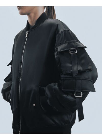 Jouez la carte de l'audace avec cette veste bomber zippée en satin, ornée d'une signature "From Future" sur la poitrine. Muni de bords côtelés, elle affiche deux poches latérales et trois poches à rabat, à liens de serrage, sur les manches longues pour une allure structurée.