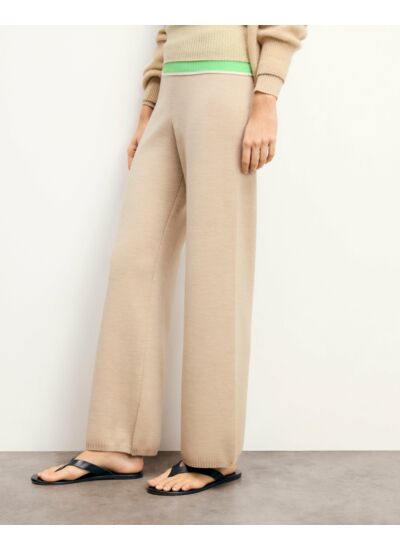 Confectionné en laine mérinos 4 fils, ce pantalon offre un tombé large, allongeant la silhouette. Muni d'une taille côtelée et de deux poches, il se porte avec le cardigan coordonné pour un ensemble décontracté.