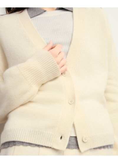 Confectionné en cachemire 4 fils, ce pull cardigan arbore une coupe courte et soignée. Un col V, une fermeture boutonnée et des manches longues confèrent une élégance intemporelle. Un indispensable à mixer avec une robe fluide ou un pantalon structuré.