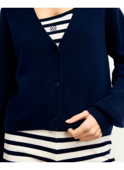 Confectionné en cachemire 4 fils, ce pull cardigan arbore une coupe courte et soignée. Un col V, une fermeture boutonnée et des manches longues confèrent une élégance intemporelle. Un indispensable à mixer avec une robe fluide ou un pantalon structuré.