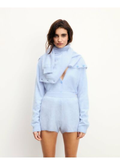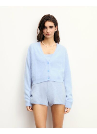 Enveloppez-vous de douceur avec ce pull cardigan en cachemire 2 fils. Sa maille brossée, d'un délicat bleu pastel, offre un jeu de textures. Court et oversize, il dévoile un col V, une fermeture boutonnée et des bords côtelés. Optez pour un look monochrome avec le top et le short coordonnés.