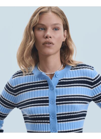 Orné de rayures contrastées, ce pull cardigan court structure la silhouette avec audace et élégance. Confectionné en cachemire 2 fils, il dévoile un col rond côtelé, des manches longues et une fermeture boutonnée. Glissez-le sur un t-shirt structuré et une jupe fluide pour un look chic et casual.