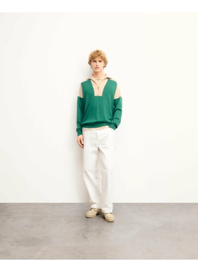 Structurez votre silhouette avec ce pull bicolore à col camionneur et épaules contrastées. Confectionné en laine mérinos 4 fils, il dévoile des manches longues et des bords côtelés. Complétez votre look de saison avec un pantalon ample ou un jean structuré.