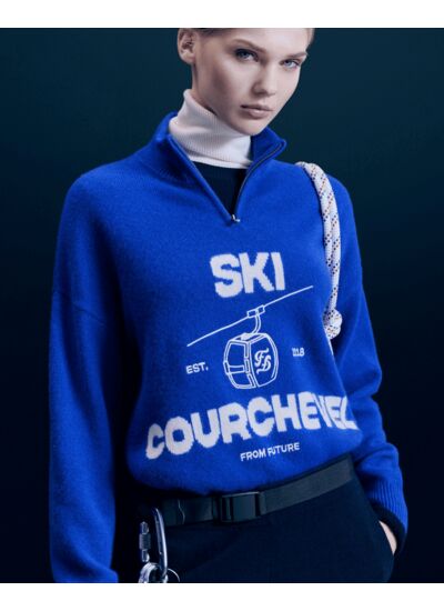 Prête à dévaler les pistes enneigées ? Confectionné en cachemire, ce pull vibrant à motif vous transporte au cœur de la station de ski Courchevel. Muni d’un col camionneur et de manches longues, il s’associe à un pantalon ample et un bonnet.
