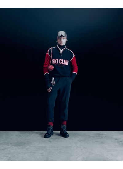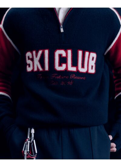 Tout schuss vers un hiver stylé dans ce pull oversize en cachemire, orné d’une inscription "Ski Club From Future Resort". Des bandes et des liserés contrastés soulignent le col et les manches longues pour une allure élégante sur les pistes enneigées.