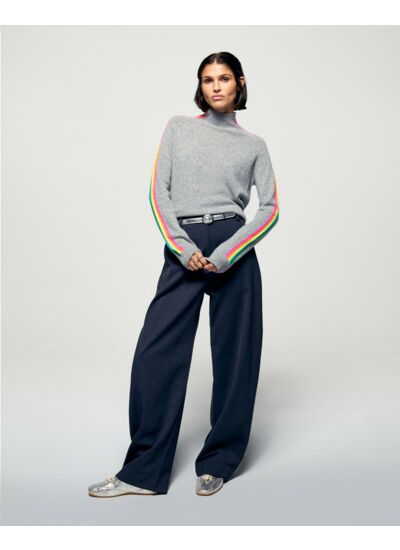 Douceur et légèreté pour ce pull court confectionné en cachemire. Muni d'un col montant et de bords côtelés, il se twiste de bandes aux couleurs vibrantes le long des manches. Idéal pour structurer la silhouette avec audace, mixez-le à un jean casual ou une jupe fluide.