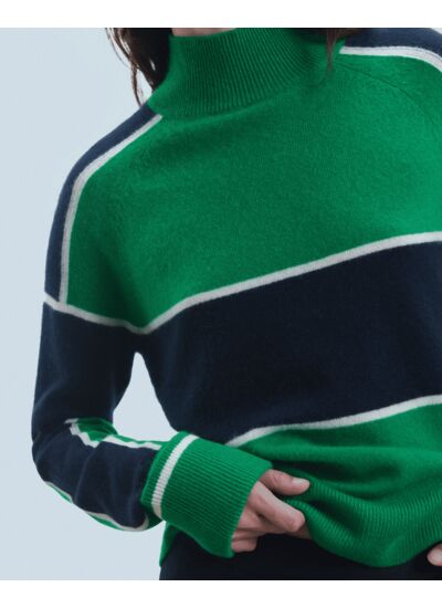 Ce pull oversize en cachemire se twiste d'un jeu de contrastes et de bandes bicolores. Muni d'un col montant, de manches longues et de bords côtelés, il confère une silhouette structurée avec audace.