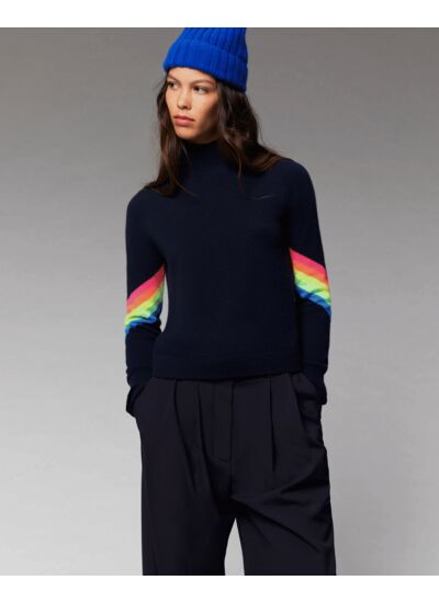 Quand l'élégance intemporelle rencontre l'audace futuriste, ce pull confectionné en cachemire 2 fils apporte une touche d'éclat à votre silhouette. Muni d'un col montant et de bords côtelés, des bandes multicolores s'invitent sur les manches longues pour twister votre allure avant-gardiste. Mêlant douceur et légèreté, mixez-le à un pantalon large marqué d'une ceinture, des sneakers et un bonnet.