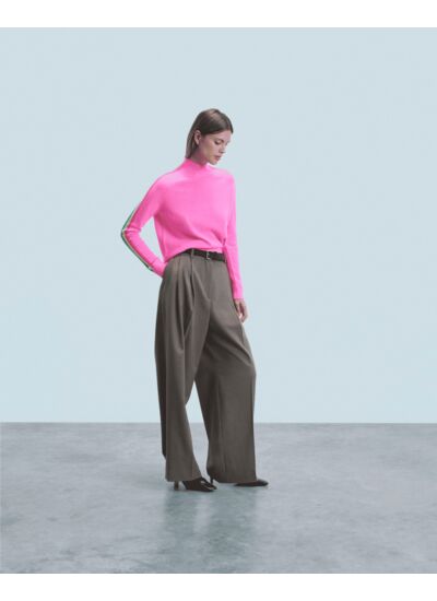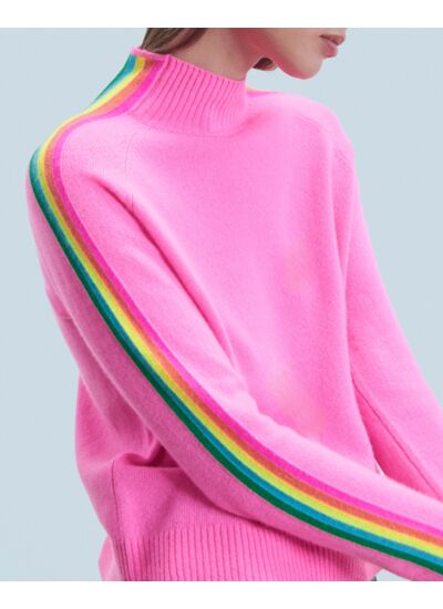 Douceur et légèreté pour ce pull court confectionné en cachemire. Muni d'un col montant et de bords côtelés, il se twiste de bandes aux couleurs vibrantes le long des manches. Idéal pour structurer la silhouette avec audace, mixez-le à un jean casual ou une jupe fluide.