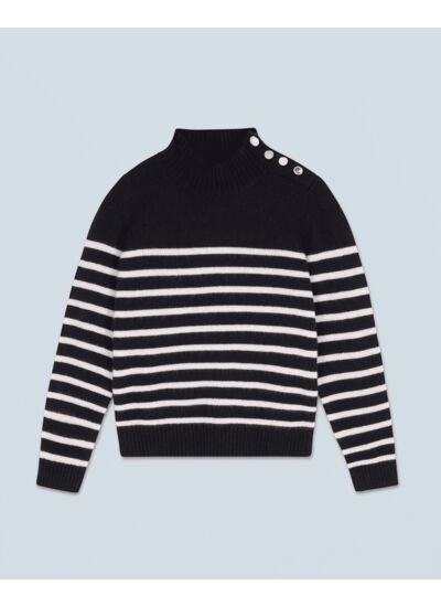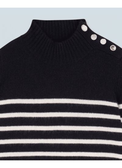 L'incontournable pull marinière se réinvente avec une touche d'audace. Confectionné en cachemire, il dévoile des manches longues, un col montant et des bords côtelés. Orné de boutons aux épaules, ses rayures contrastées confèrent une silhouette décontractée en toute élégance. Facile à mixer, portez-le sur une robe fluide ou associez-le à un jean casual.
