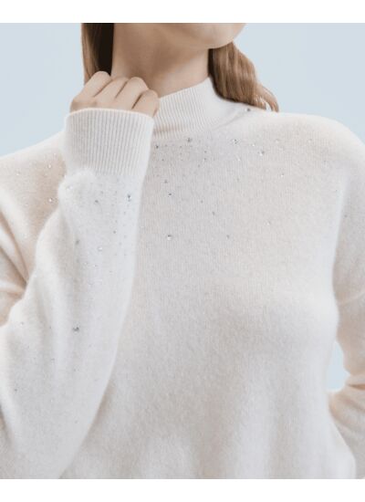 Confectionné en cachemire léger, ce pull court est parsemé de strass étincelants, qui soulignent délicatement le col montant. Les manches longues et les bords côtelés lui confèrent une allure structurée, tout en douceur. Optez pour un look chic en l'associant à une jupe fluide et des escarpins.