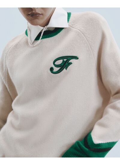 Orné d'une signature brodée "F" sur la poitrine, ce pull long et oversize adopte une maille douce en 100% cachemire. Des bandes bicolores soulignent le col rond, les manches longues et les bords côtelés, pour une allure chic et structurée. Associez-le à un jean ample ou une jupe fluide pour un look chic et casual.
