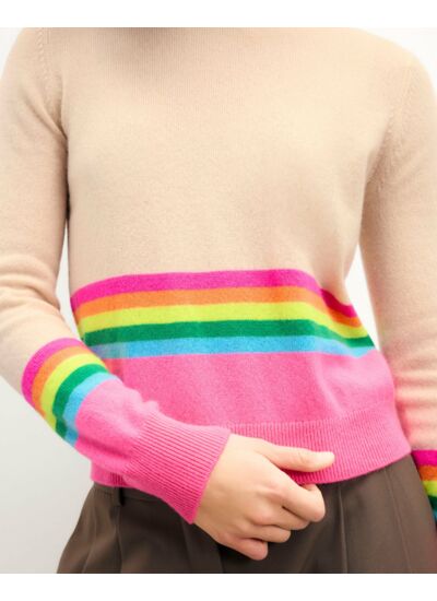 Confectionné en cachemire 2 fils, ce pull court révèle des bandes multicolores pour une allure vibrante et audacieuse. Muni d'un col rond, de manches longues et de bords côtelés, il se porte sans effort avec votre denim préféré.