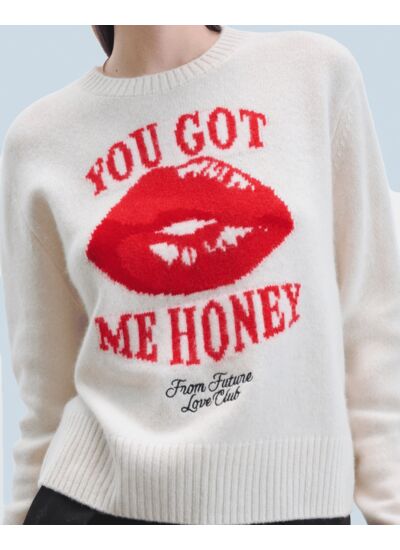 Laissez-vous séduire par ce pull audacieux, orné d'un motif red lips "You Got Me Honey" irrésistible. Confectionné en cachemire, il est muni d'un col rond, de manches longues et de bords côtelés.