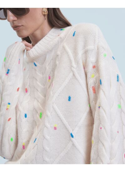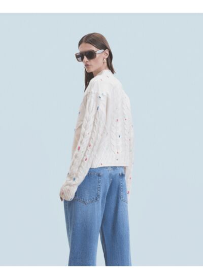 Confectionné en cachemire, ce pull court et oversize se twiste d'un jeu de torsades et de broderies multicolores réalisées à la main. Muni d'un col montant, de manches longues et de bords côtelés, il vient réchauffer votre allure avec un supplément d'audace.