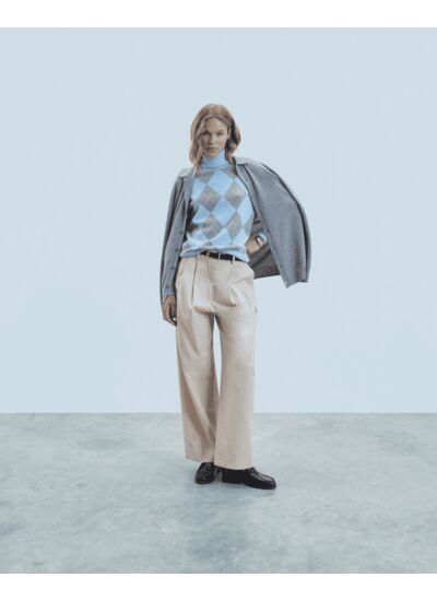 Jeu de lignes pour ce pull oversize confectionné en cachemire. Muni d'un col roulé, de manches longues et de bords côtelés, il dévoile des losanges contrastés. Mixez-le à une jupe fluide ou un pantalon de tailleur pour un look sophistiqué.